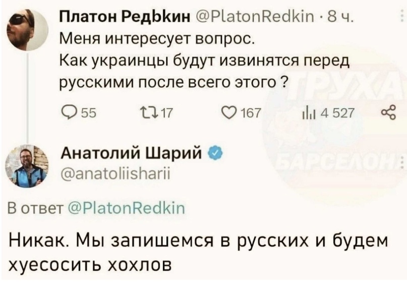 Эталонный укр А.Шмарий так и говорил на вопрос, какие у укров будут варианты расплаты в конце, после того как много кровавого говна русским и России наделали: "Мы просто переобуемся в русских и будет ху*****ть каклов".